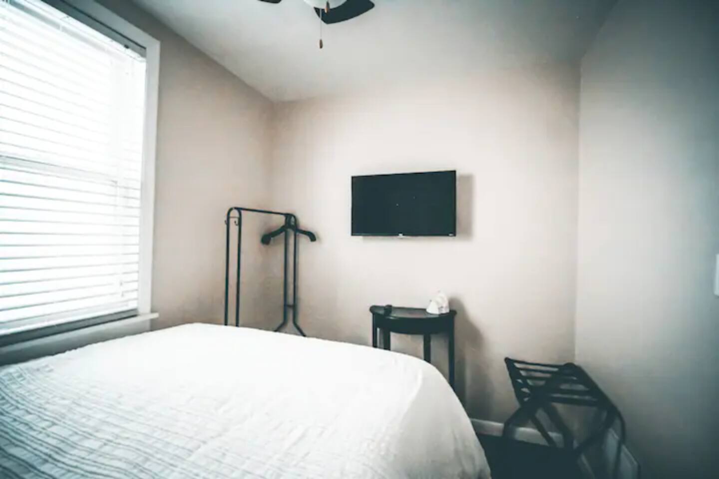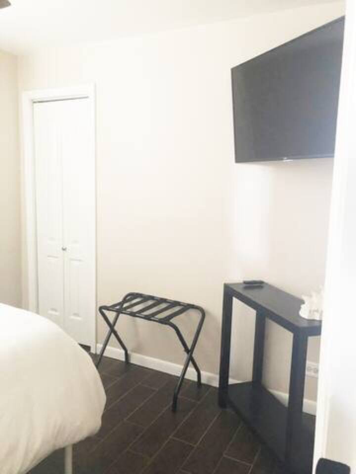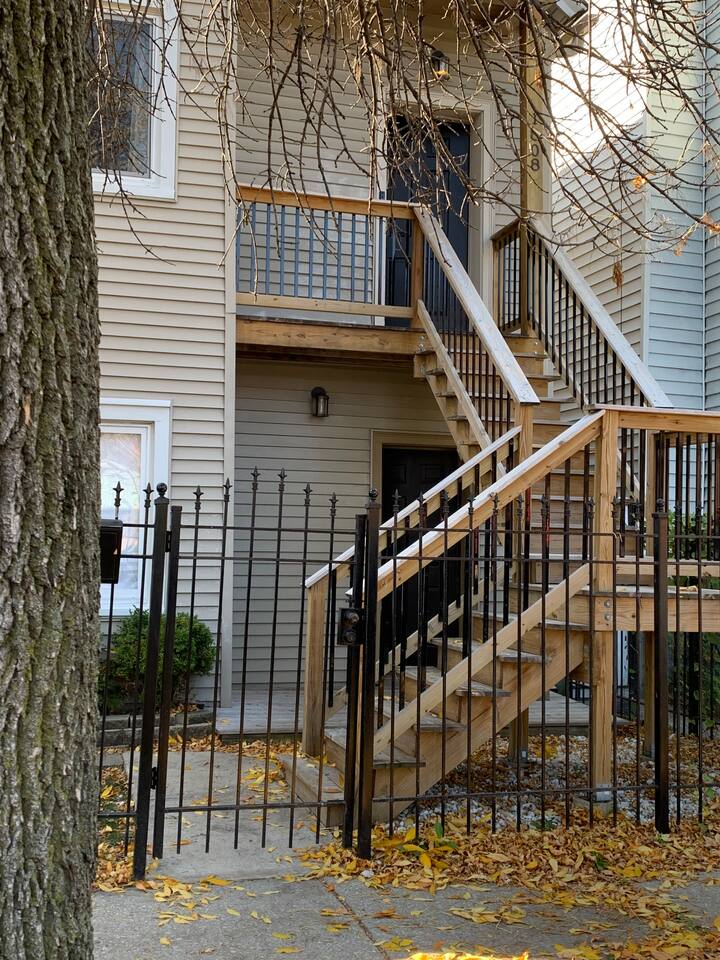 Top floor 2 bed/1 bath (1 queen-sized, and 1 full-sized) open concept apartment in a quaint two-floor building. -Free private covered garage space included in your nightly rate with the ability to rent the 2nd space for a $50 flat fee during your stay. -Guest-controlled Central Air/Heat. -Dishwasher, filtered water line, stainless steel appliances, and granite countertops. -Fully functional kitchen with the basics that you would need to cook a meal at home. (coffee, tea, creamer, salt/pepper, and oil). -Private In-Unit Washer and Dryer available for use during your stay. -Small private patio area with seating for use during the Spring and Summer months.
