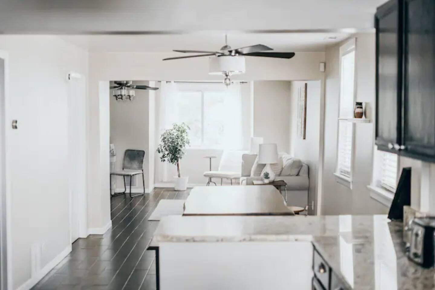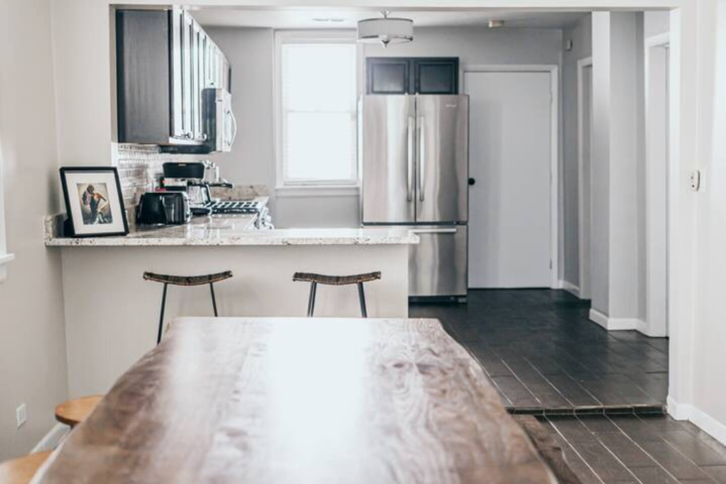 The light to the kitchen is right behind the fridge directly to your right-hand side when walking into the kitchen from the back door. 1 garage space is included in the nightly rate. We offer the option of renting the 2nd garage space for a $50 (flat fee) if you so choose. *Noise detection device on site that alerts hosts to parties and or concerning disturbances. (Zero tolerance for parties or inconsiderate groups). We require a $100 security deposit be placed on file through our property management software, Hospitable. The deposit will be witheld 2 days before arrival, and will be released 2 days after the completion of your stay if no damages are reported.